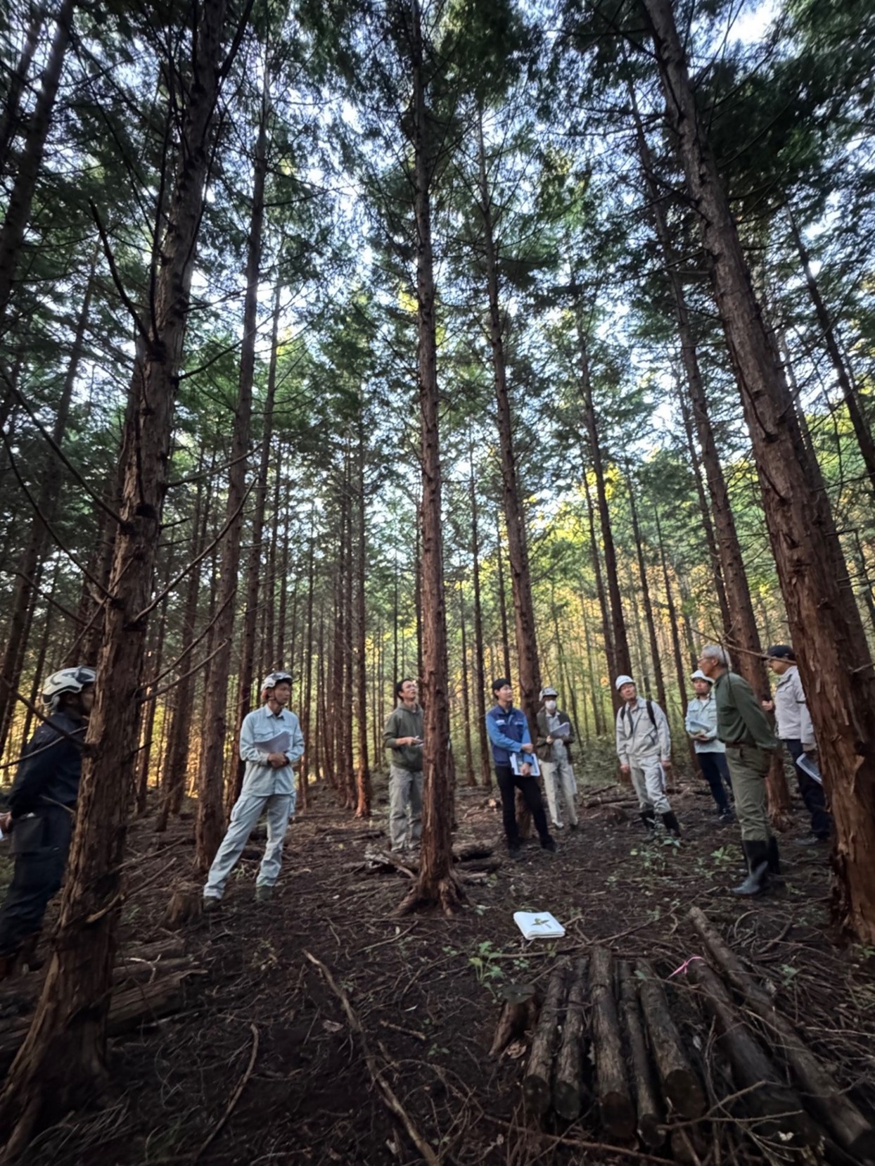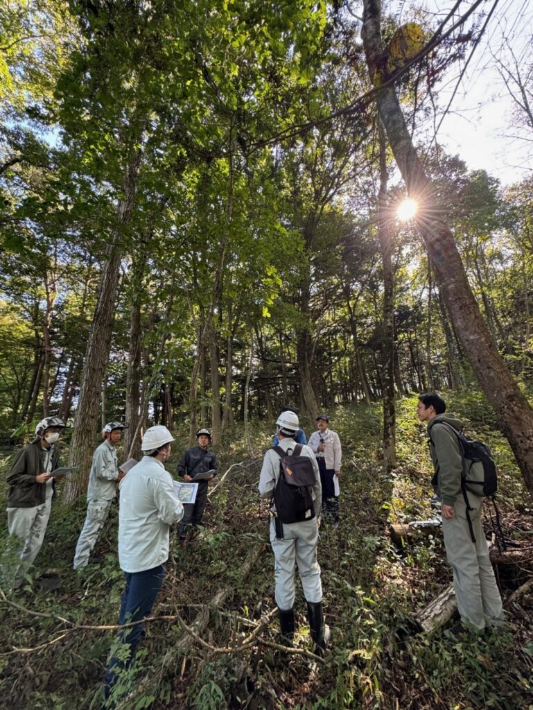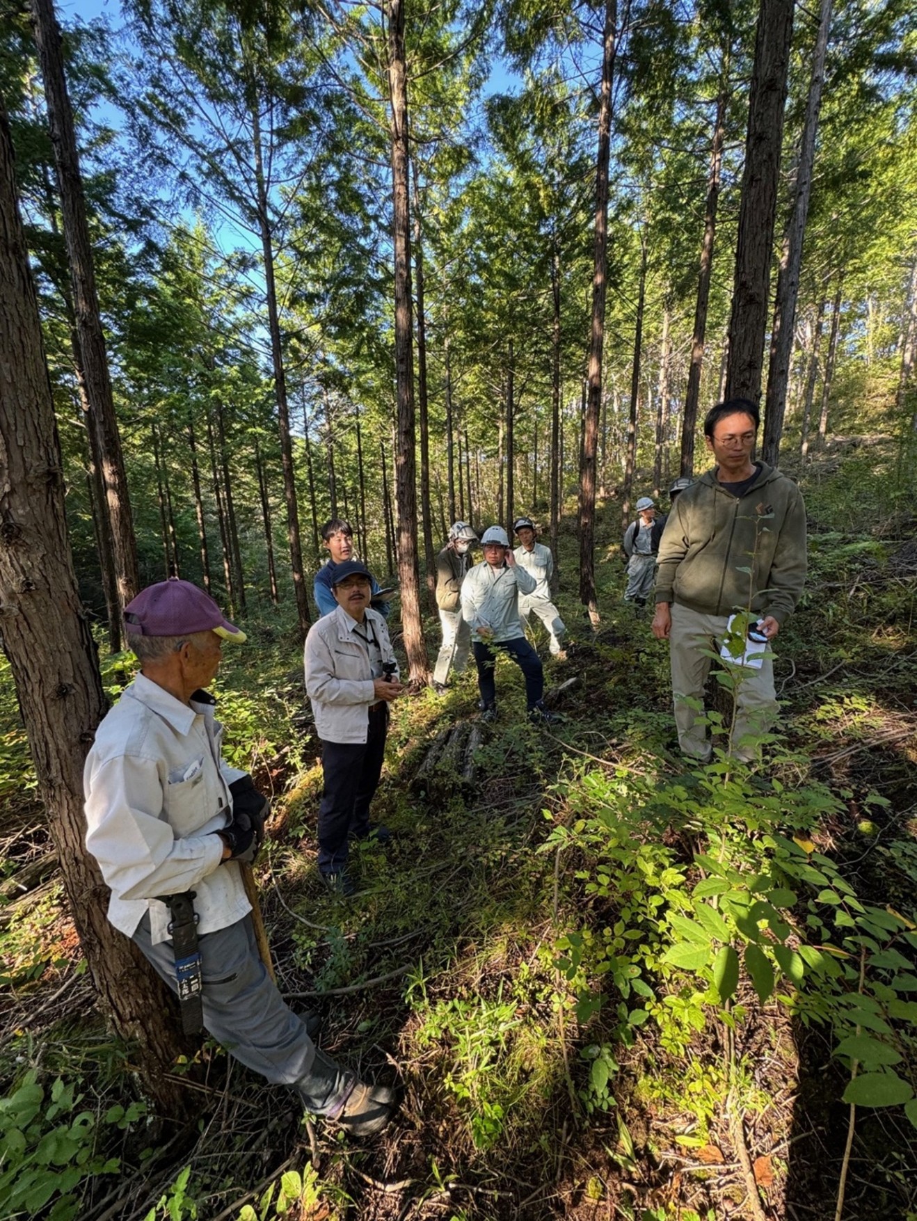 そこで2025年度は、これまでに間伐が実施された各林地での見学会を実施いたしました。見学会は10月15日におこなわれ、福島県森林組合連合会、相馬地方森林組合、地元の山林所有者の方をはじめ、南会津の木材生産者、いわき市の山林所有者などがご参加されました。